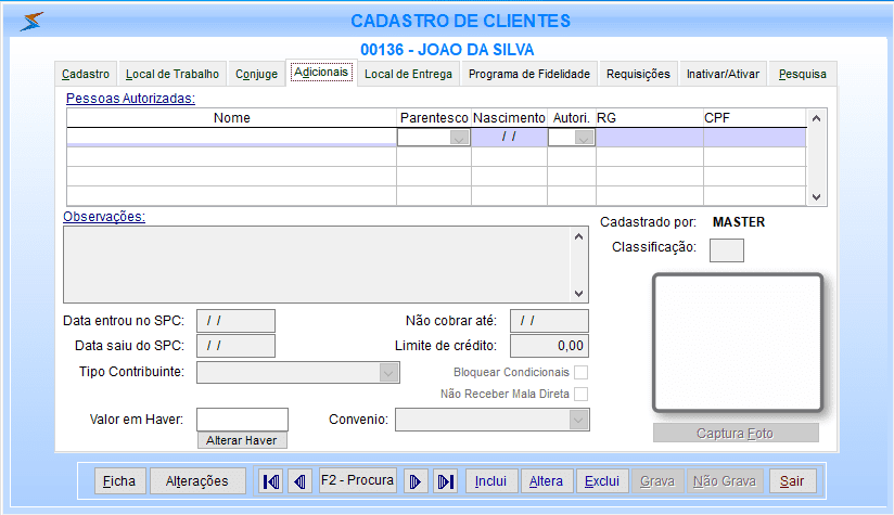 Permite adicionar uma foto ao cadastro do cliente. A foto é exibida na tela de venda, facilitando a identificação do cliente. A captura pode ser feita através de uma webcam ou através de arquivo gravado no computador.