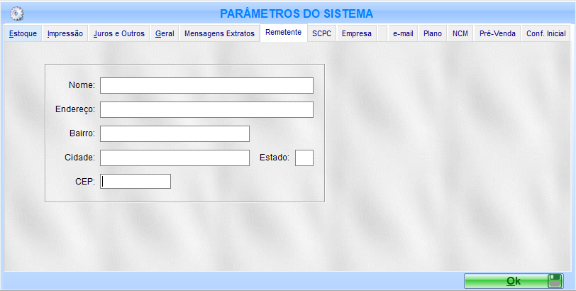 Módulo 'Retaguarda'Parâmetros do Sistema Aba 'Remetente' Aba 'Remetente' Esta tela permite o cadastro dos dados da empresa para posterior utilização como remetente na comunicação com os clientes.