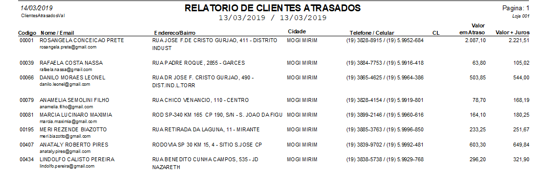 Exemplo de um relatório de Clientes em atraso, com valor:
