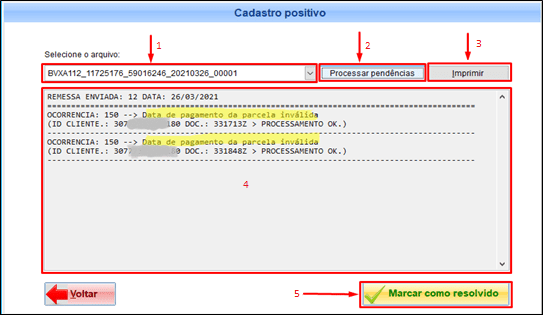 Lembre-se: Sempre que houver pendências o botão Imprimir (3) será habilitado, possibilitando a impressão das ocorrências.