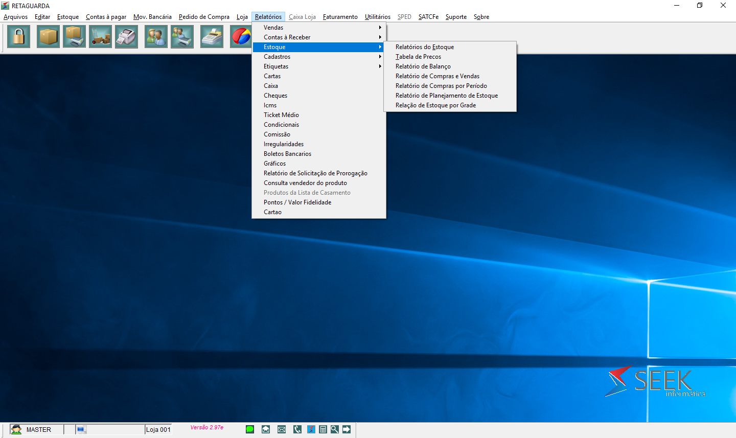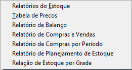 Relatórios Estoque Relatórios - Estoque No módulo 'Retaguarda', menu 'Relatórios', ao clicar em 'Estoque', será exibida a tela abaixo: Selecione o 'Relatório de Estoque' desejado, entre as opções: