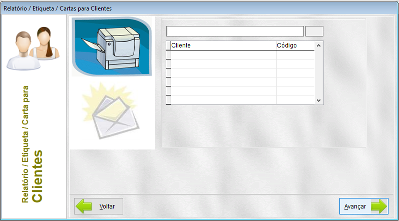 Na tela 'Relatório / Etiqueta / Cartas para Clientes', conforme abaixo:
