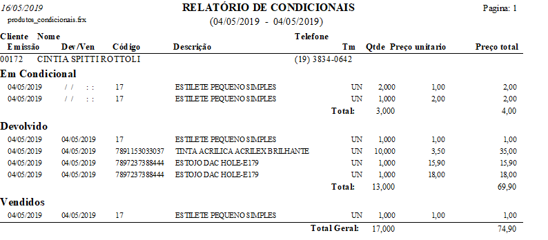 Após clicar em 'Produtos em Condicional' será exibida a tela abaixo: