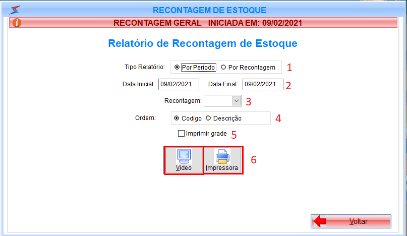 - Para essa opção selecione: a data inicial e a data final [2], o código da recontagem [3], a ordenação do relatório (Código ou Descrição) [4], marque (ou não) Imprimir grade [5].