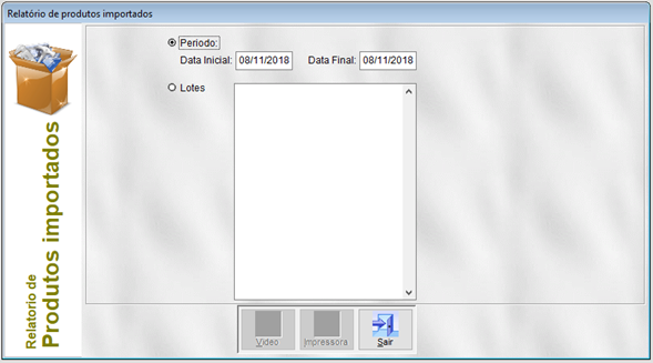 Este relatório apresenta todos os produtos que foram importados em uma operação de entrada por transferência. O relatório pode ser apresentado por dia ou por lote.